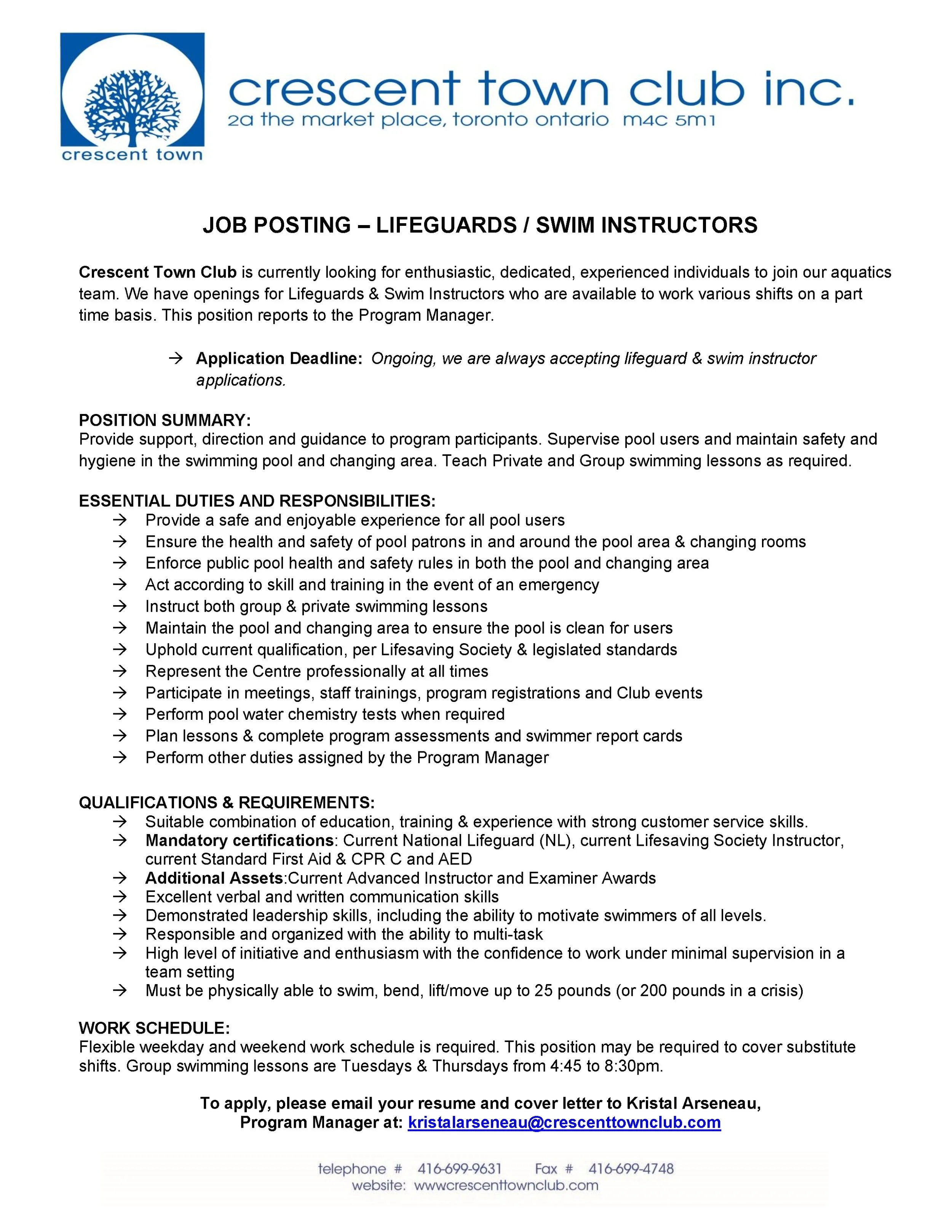 Crescent Town Club is currently looking for enthusiastic, dedicated, experienced individuals to join our aquatics team in 2025. We have openings for Lifeguards & Swim Instructors who are available to work various shifts on a part time basis.